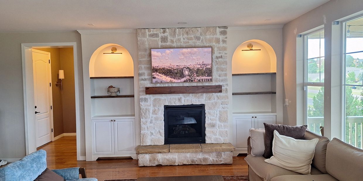 From an antiquated simple corner inset, to a modern beautiful center piece fireplace with built-ins and custom arched shelving.